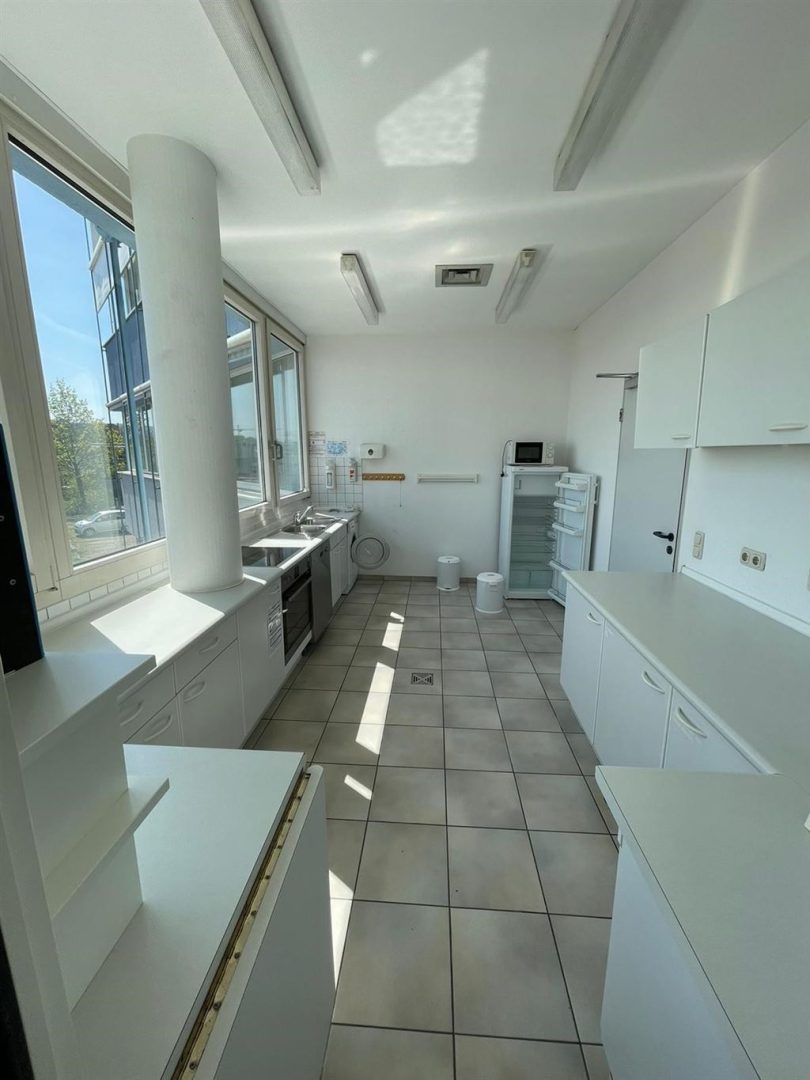 Im Erdgeschoss eines gepflegten Bürogebäudes befindet sich die flexible und vielfältig nutzbare Gewerbefläche. Teilweise bodentiefe Fenster lassen viel Licht in die Räume. Die Bodenbeläge sind unterschiedlich. Im Westlichen Teil ist Teppichboden und im östlichen Bereich sind helle Fliesen verlegt. 2 Teeküchen (eine davon mit ca. 13 m²) sind ebenfalls vorhanden. Im Gebäude befindet sich noch ein Aufzug.